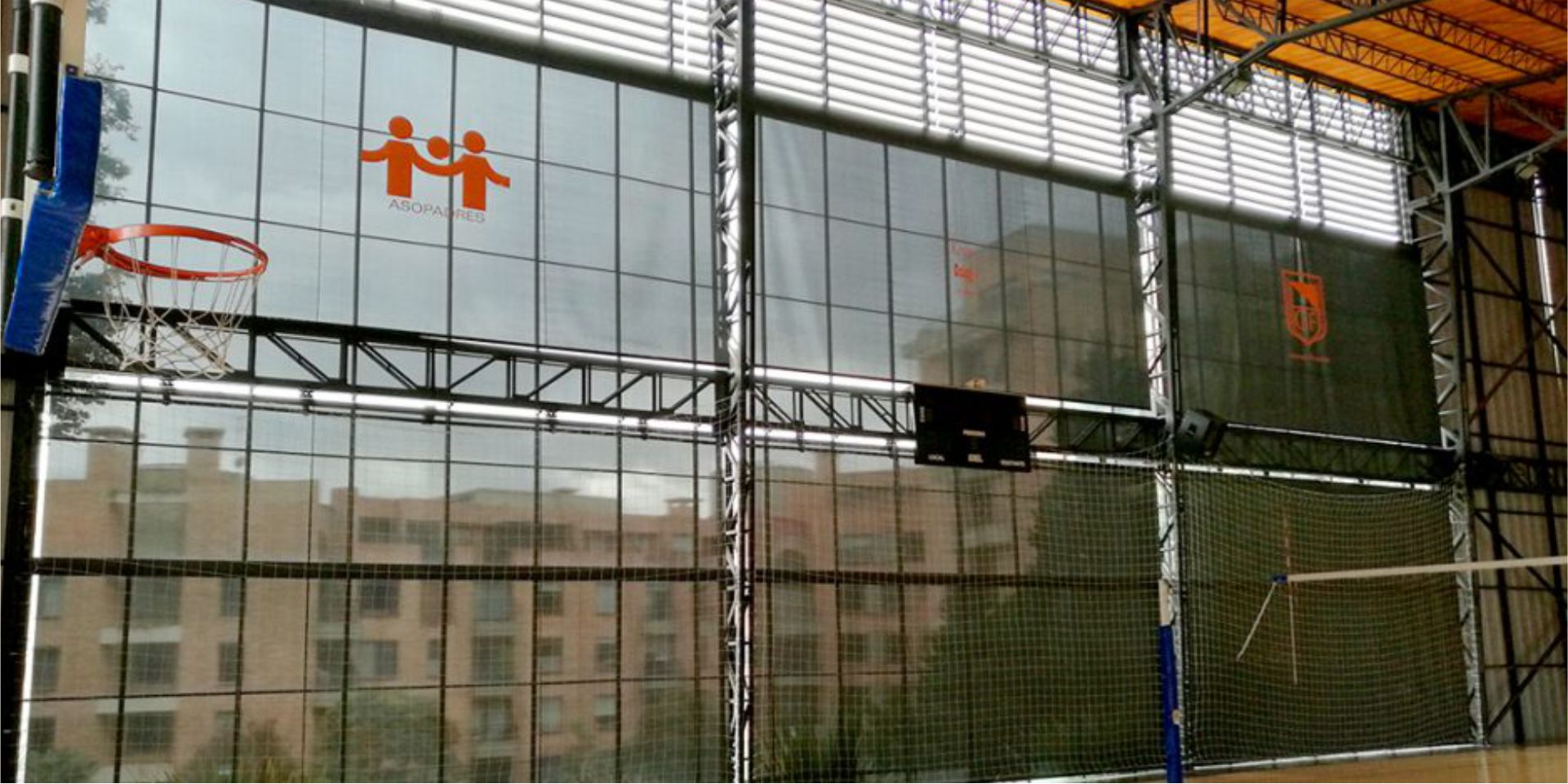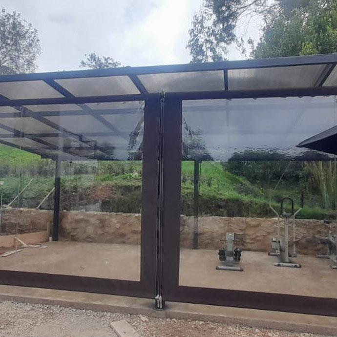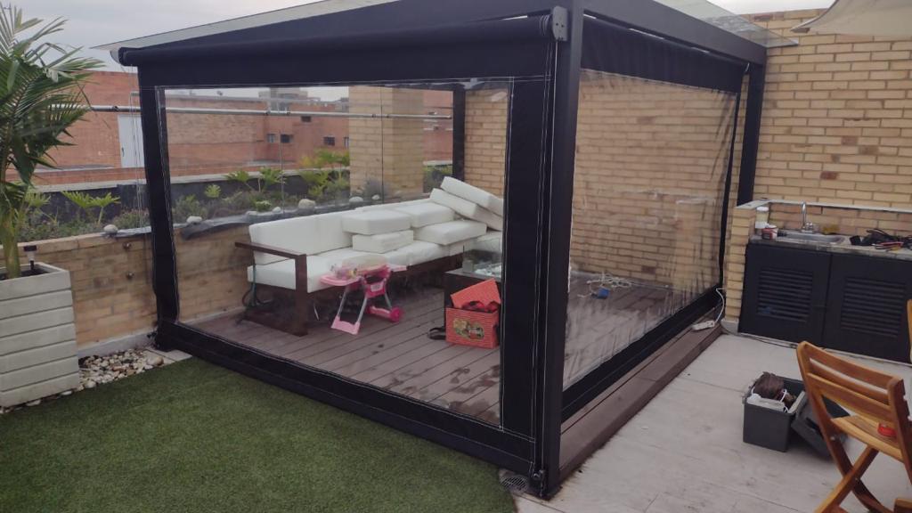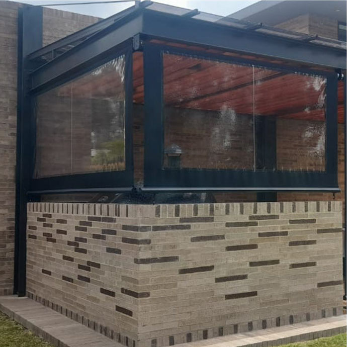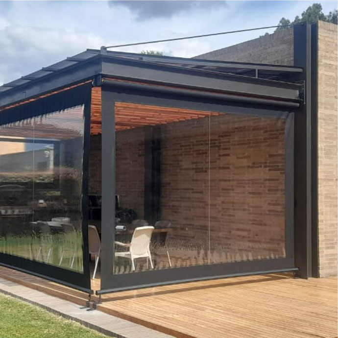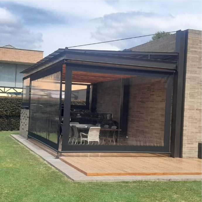 Los ofrecemos con un sistema guiado a través de guayas laterales que permiten enrollar y desenrollar el toldo a conveniencia o con anclaje al piso.